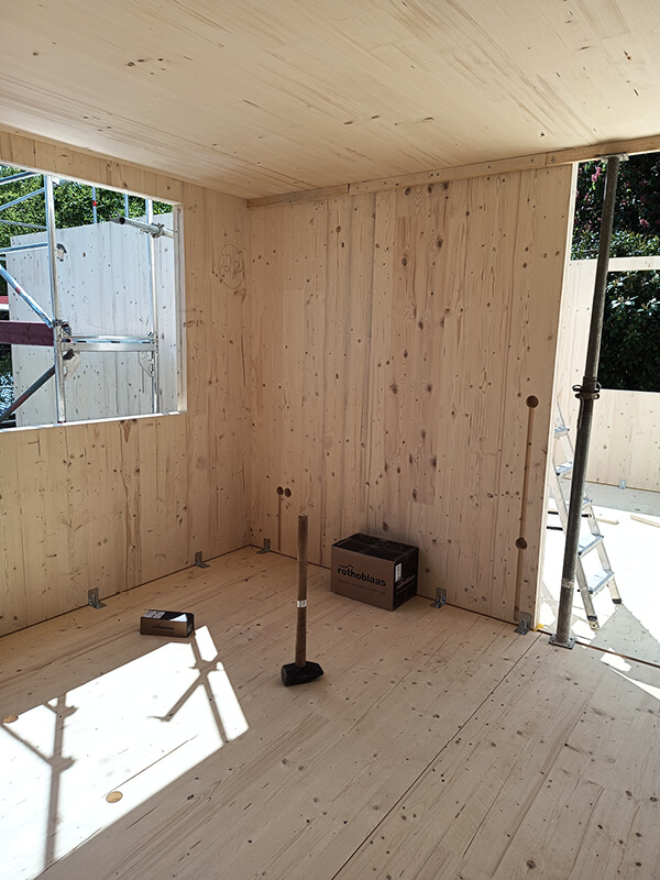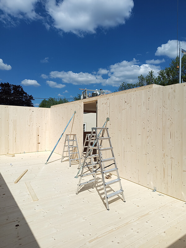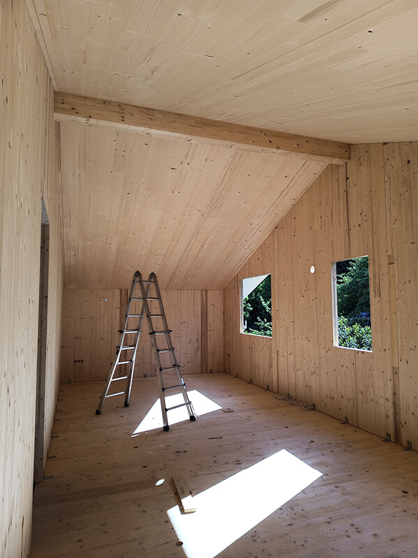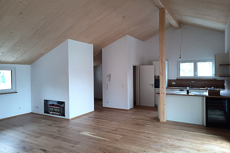 Neubau mit 3 Wohnungen in Zizenhausen in Brettsperrholz-Bauweise und Fertigteilkeller. Sichtbare Holzdecken und -Dach aus Brettsperrholz in Wohn-Sichtqualität. Wände mit 10cm Brettsperrholz (NSi) beplankt mit Gipskarton, verspachtelt und gestrichen.